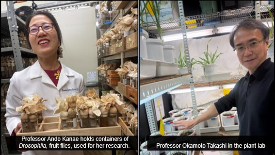 Professor Ando Kanae holds containers of Drosophila, fruit flies, used for her research: Professor Okamoto Takashi in the plant lab