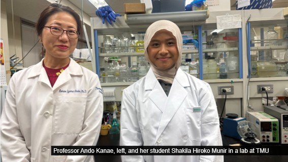 Professor Ando Kanae, left, and her student Shakila Hiroko Munir in a lab at TMU